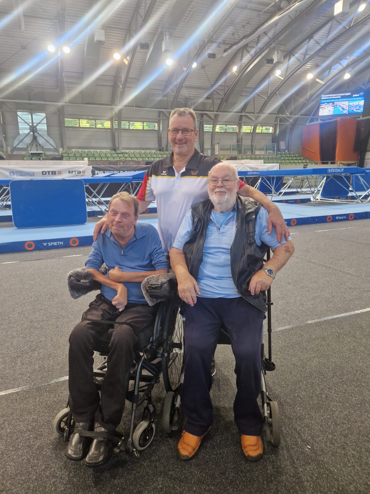 In Berlin fand die Urnenbeisetzung von Bernd Gallkowski statt, der plötzlich und unerwartet im Alter von 61 Jahren verstarb. Bei einem Vereinstrainingsunfall im Jahre 1981 verletzte er sich an der Halswirbelsäule und war nach diversen Operationen seither nicht nur auf den Rollstuhl sondern zudem auf Pflegepersonal angewiesen. Bernd, Mitglied des VfL Lichtenrade, gehörte bis dahin der Jugend-Nationalmannschaft an. Er wurde in der langen Leidenszeit u. a. durch die Stiftung Deutsche Sporthilfe unterstützt. Zur Trauerfeier fanden sich einige ehemalige Trainings- und Wettkampffreunde ein und nahmen Abschied. Zuletzt war Bernd Gallkowski im letzten Jahr beim World-Cup in Cottbus vor Ort und staunte nicht schlecht, wie sich insbesondere der Schwierigkeitsgrad in den letzten Jahren enorm entwickelt hat. Auf dem Foto mit dem amtierenden Bundesliga Chef Olaf Schmidt zu sehen sind Bernd Gallkowski sowie sein Vater Arnim, der wiederum viele Jahre als Landesfachwart in Berlin für das Trampolinturnen verantwortlich war.