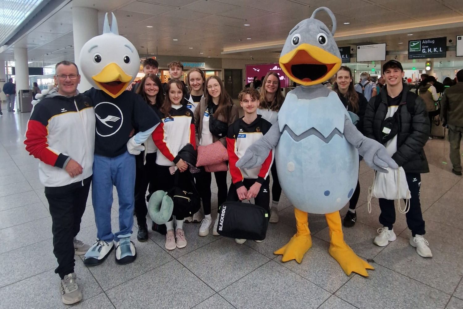 Während die Trampolin Sportler der EM / JEM am Ostermontag von Frankfurt am Main den Flug nach Faro antraten, versammelten sich am Airport München die DMT-Springer. Vom dortigen Flughafen wurden sie von Ostereiermaskottchen (Foto) verabschiedet. Bei den kontinentalen Titelkämpfen in Portugal starten 20 deutsche Sportler im Trampolinturnen und wiederum 12 beim Doppel-Mini-Tramp Springen. Mit mehreren hundert Sportlern aus insgesamt 30 Nationen ein Rekord Teilnehmerfeld in Portimao. Mitte der Woche beginnen die mehrtägigen Wettbewerbe, wobei teils neue Alterseinteilungen aber auch weitere Disziplinen wie Mixed Synchron angeboten werden. Keine leichte Aufgabe für die Organisatoren an der Algarve als auch für das neu gewählte Technische Komitee des Verbandes European Gymnastics.