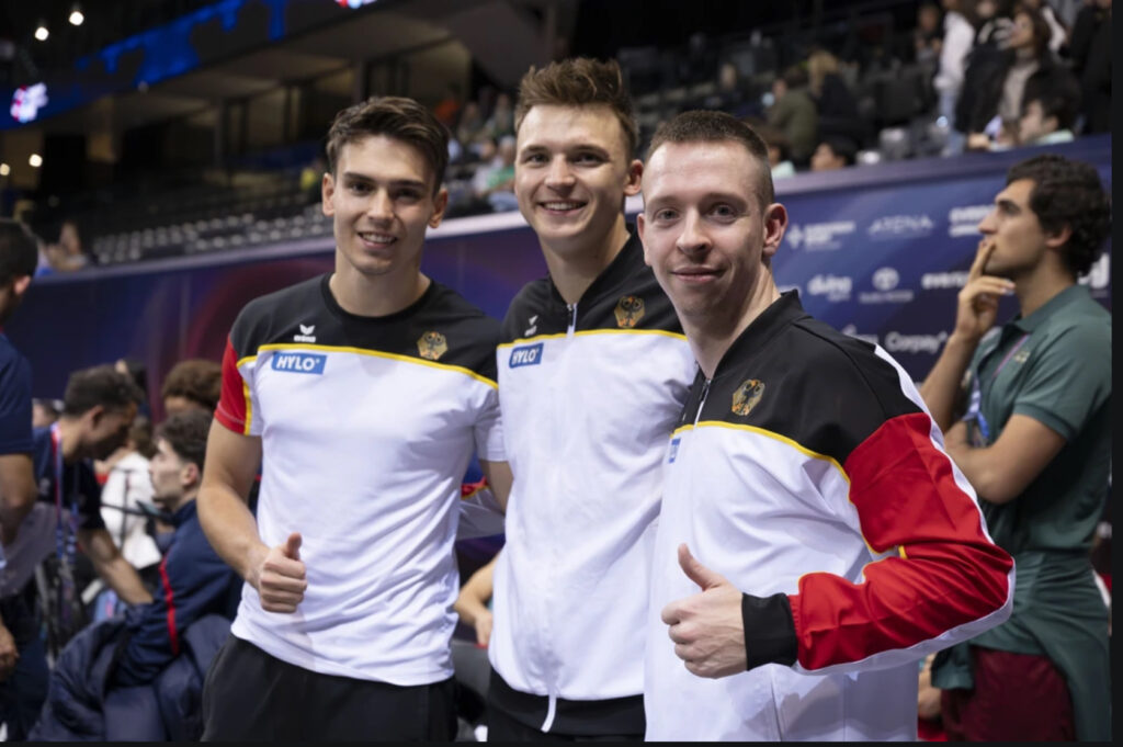 Am vorletzten Tag der Weltmeisterschaft in Pamplona standen am Samstag Abend die Trampolin Team Entscheidungen auf dem Programm, zu dem sich die DTB Herren (Foto) qualifizieren konnten. Mit vollem Schwierigkeitsgrad gelangen Matthias Schuldt, Caio Lauxtermann und Fabian Vogel ihre sehenswerten Kürübungen. Schließlich sprang Platz sieben dabei heraus, wobei das seitens der FIG angewandte Punktesystem durchaus mit Fragezeichen zu versehen ist.