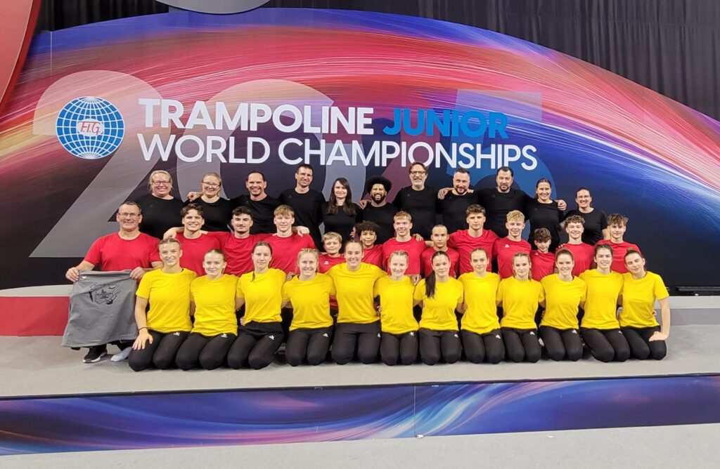In der langen Geschichte der internationalen Nachwuchswettbewerbe, die seitens des damaligen Weltverbandes FIT im Jahre 1973 in London ihren Startschuss erhielten und fortan nach den Weltmeisterschaften der Erwachsenen ausgetragen wurden, finden auch dieses Mal wieder World-Age-Group Competitions statt, doch eingebettet sind erstmals offizielle Welttitelkämpfe für die 15/16 Jährigen Junioren. Dazu haben sich in Deutschland sieben Jugendliche für Pamplona qualifizieren können. Waren in der letzten Woche bei der WM der Erwachsenen deutsche Sportler aus den Leistungszentren Bad Kreuznach, München und Frankfurt beteiligt, gehören die JgWM Sportler zum Zentrum Münster, Cottbus, Stuttgart und Frankfurt. Auf dem Foto sehen wir von links Tobias Leitner und Bruder Michael, beide TG Münster, dazwischen Yorick Gerdes (SC Cottbus) sowie rechts Jonas Kaiser (TG Schömberg). Vorne stehen Greta Steinbrenner und Eunike Postiglione, beide Frankfurt FLYERS sowie Thea Hohmann vom TT Niedernhausen. Sie starten in den Trampolin Disziplinen Einzel und Synchron.