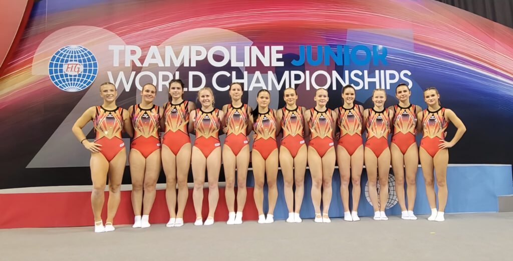 In Pamplona sind am Donnerstag Nachmittag die Jugend-Wettkämpfe eröffnet worden. Der Deutsche Turner-Bund ist dort mit 12 Girls (Foto) und eben so vielen Boys vertreten. Sie starten größtenteils auf dem Trampolin, vereinzelt auch im Doppel-Mini-Tramp Springen. Der erste Tag Trampolin Vorkampf Wettbewerbe sowohl der jüngeren als auch der älteren Jahrgänge, wobei sich Lars Garmann, Pauline Hering und Luisa Braaf (alle TRA) sowie Joel Achille (DMT) für die Endkämpfe qualifizieren konnten. Am heutigen Freitag nun steigen die Sportler ins Wettkampf Geschehen ein, die um die Medaillen der Jugend Weltmeisterschaften 2025 kämpfen.